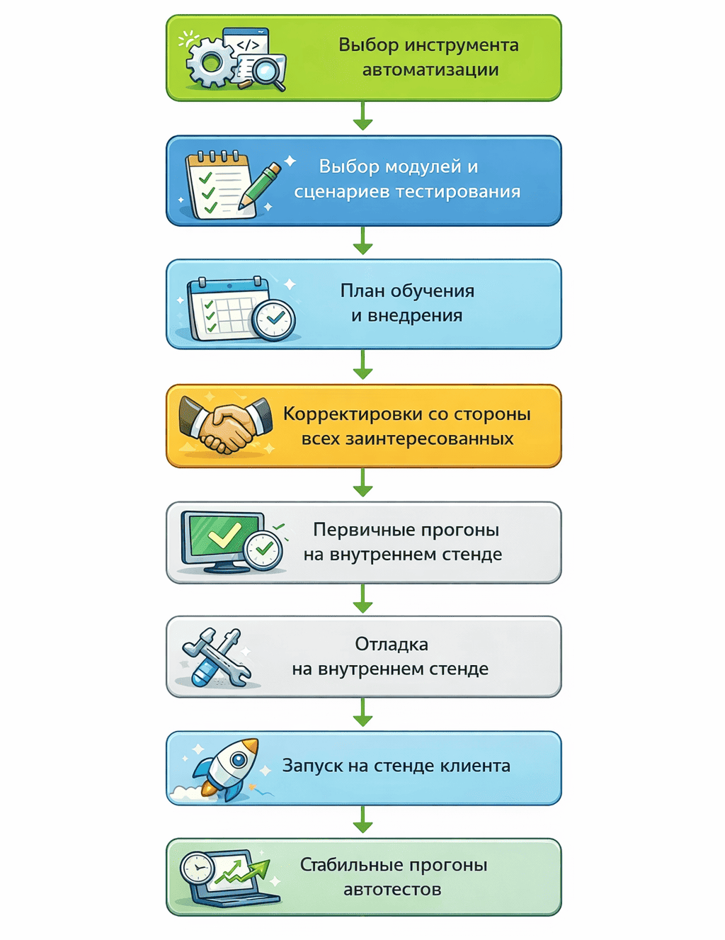 Успешным завершением первого этапа мы считаем стабильные прогоны автотестов на тестовых стендах коммерческих проектов, подготовленные внутренние технические материалы по использованию инструмента и зафиксированный список сценариев, осознанно отложенных на следующий этап. Такой результат создаёт основу для масштабирования и позволяет двигаться дальше, в светлое будущее, где вкалывают роботы, а не человек.