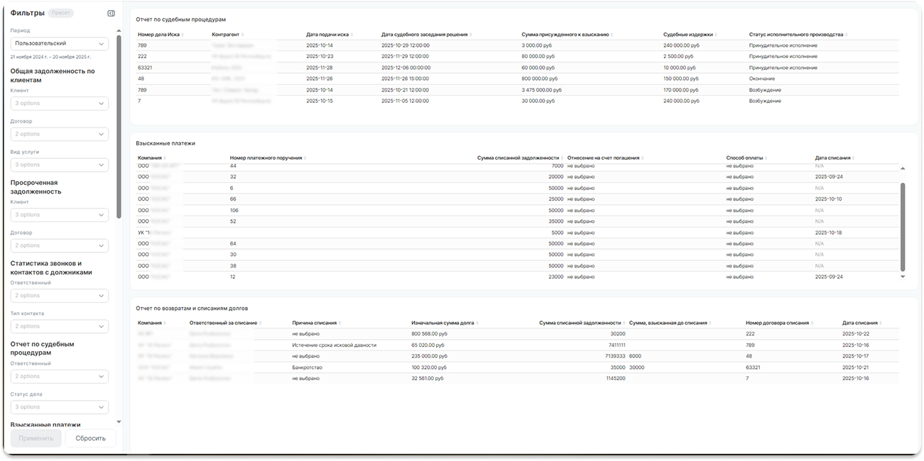 Настраивайте дашборды с отчетностью по контрагентам, чтобы наглядно наблюдать за статистикой взысканий, судебных процедур и контактов с должниками.