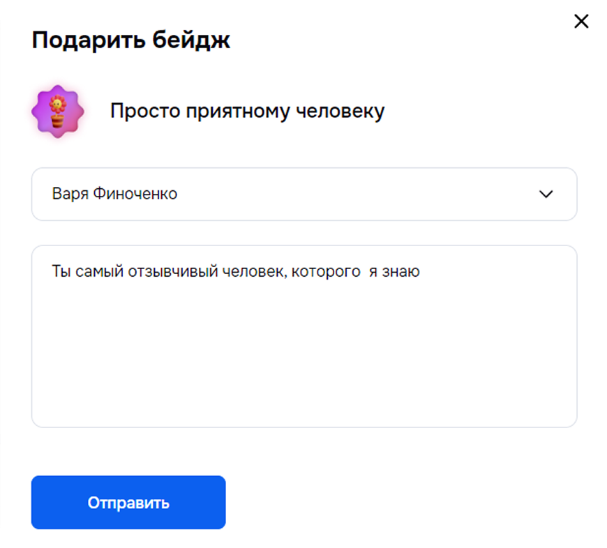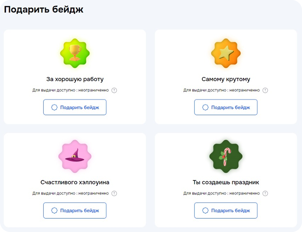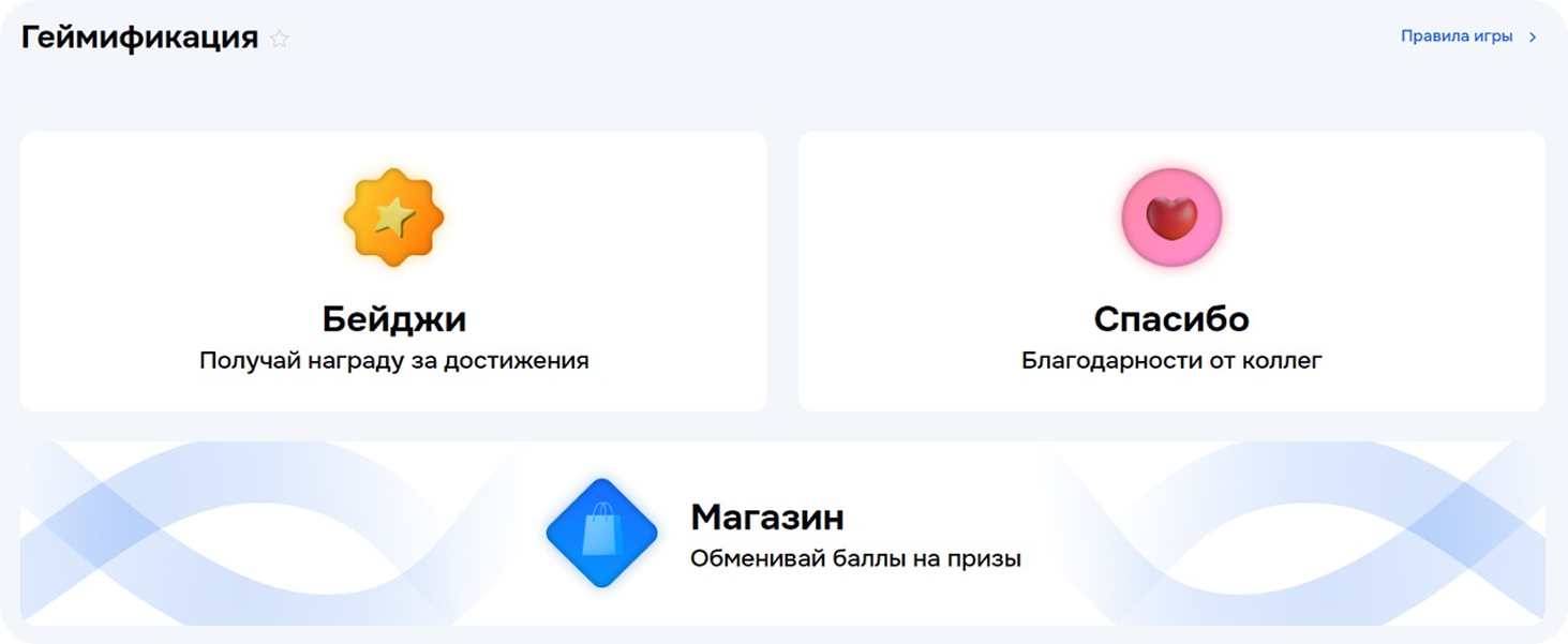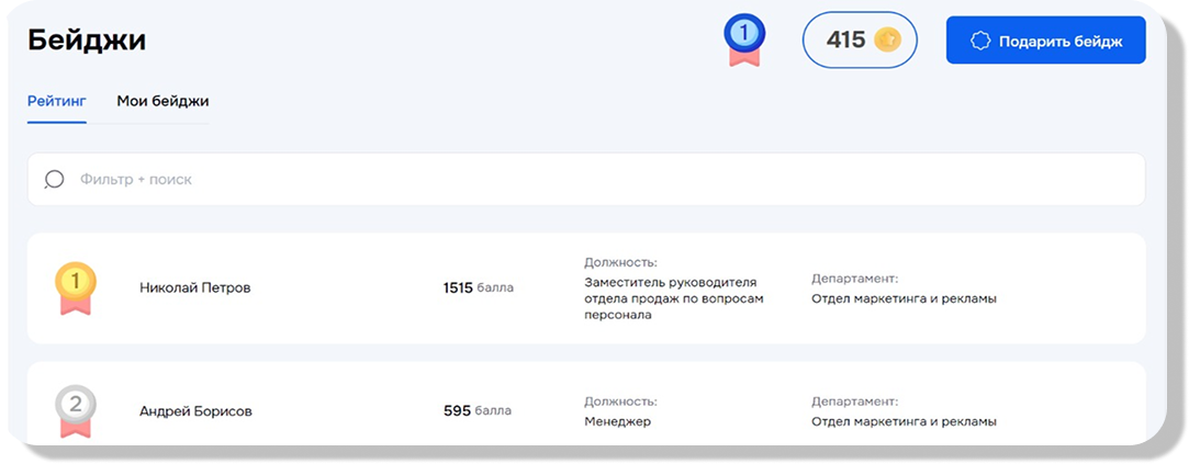 Бейджи — виртуальные значки, имеющие свою. Они вручаются за выполнение целевых действий, например, достижение KPI, успешную адаптацию нового сотрудника или внедрение идеи, улучшившей рабочие процессы. Можно выдавать как вручную, так и автоматически.
