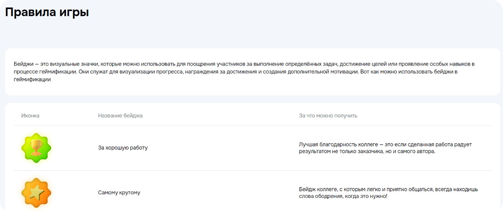 «Правила игры» — это раздел, где вы можете разместить инструкцию с подробным описанием того, как и за что пользователи могут получить бейджи.