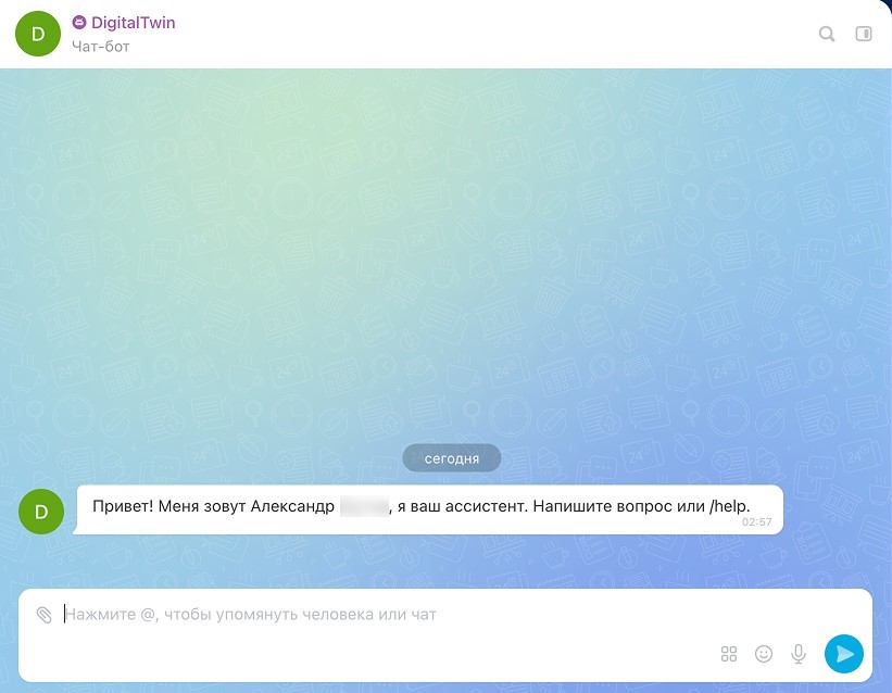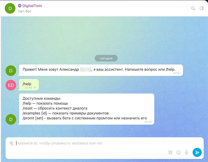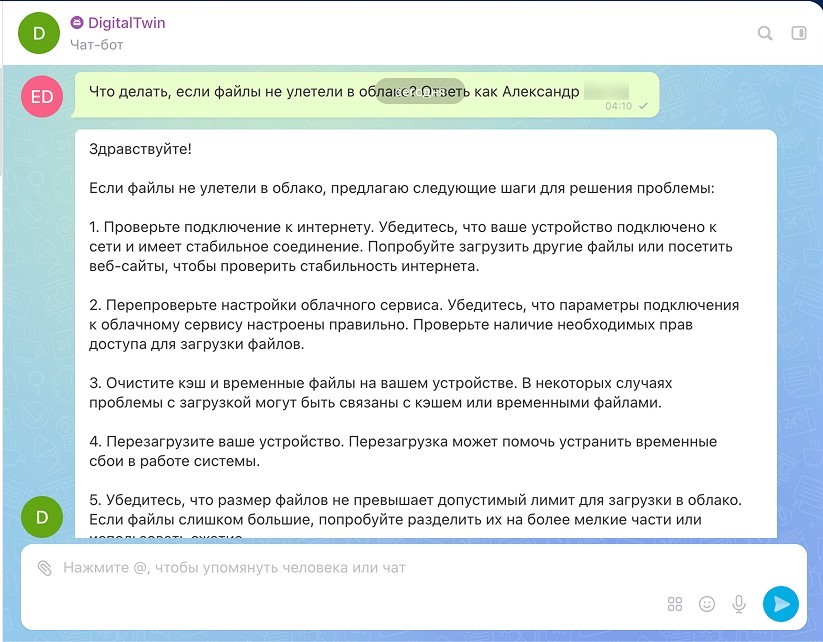 Цифровой двойник делает экспертизу ключевых сотрудников доступной 24/7. Вам больше не нужно ждать их ответа или прерывать их работу. Просто задайте вопрос в специальном чате: